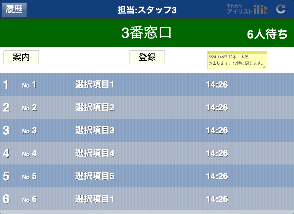 メモ機能・ふせんメモ機能 アイリストではお客様に対しての「メモ機能」、スタッフ間の情報共有などに使える「ふせんメモ機能」の2種類が利用できます。 メモ機能 各受付番号に対して、メモを残すことができます。 ①メモを入力したリストの番号は、黄文字になります。 ②黄色になっている数字を押すと確認、編集ができます。 ③上部のメモアイコンを押すとメモの内容が確認できます。 ④メモの内容が一覧で確認できます。 ふせんメモ機能 ふせんメモ機能を利用して、アイリストをスタッフ間の情報共有ツールとして利用できます。 ①ふせんメモを入力します。 ②アイリストの窓口画面全てに反映されます。 画面トップに戻る 順番待ちシステム アイリストトップへ このページを読まれた方は、以下のページにも関心を持たれています。: 順番待ち受付システム「アイリスト」の機能 ①発券機での整理券発行 ②待ち方の選択 ③電話自動呼出し ④外部からの順番確認 ⑤多言語対応 ⑥選択項目を自由 […]... 窓口案内システム | 受付システム アイリスト 旅行代理店・携帯ショップ・保険代理店・金融機関などの窓口案内業務に 窓口案内システムは、タッチ操 […]... 店内・館内アナウンス 店内・館内アナウンスについて 動画 案内表示機とセットでのご利用もできます。⇒詳細 […]...
